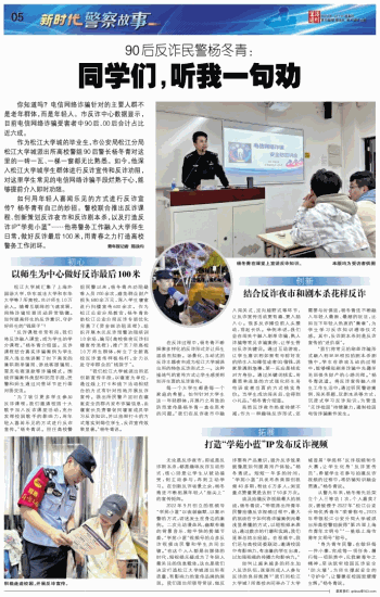 你知道吗?电信网络诈骗针对的主要人群不是老年群体,而是年轻人。市反诈中心数据显示,目前电信网络诈骗受害者中90后、00后合计占比近六成。 作为松江大学城的毕业生,市公安局松江分局松江大学城派出所高校警组90后警长杨冬青对这里的一砖一瓦、一梯一窗都无比熟悉。如今,他深入松江大学城学生群体进行反诈宣传和反诈劝阻,对这里学生常见的电信网络诈骗手段烂熟于心,能够提前介入即时劝阻。 如何用年轻人喜闻乐见的方式进行反诈宣传?杨冬青有自己的妙招。警校联合推出反诈课程、创新策划反诈夜市和反诈剧本杀,以及打造反诈IP“学苑小蓝”……他将警务工作融入大学师生日常,做好反诈最后100米,用青春之力打造高校警务工作闭环。 青年报记者 陈泳均 初心 以师生为中心做好反诈最后100米 松江大学城汇集了上海外国语大学、华东政法大学和东华大学等7所高校,共计师生10万余人。随着互联网的飞速发展,网络诈骗犯罪活动异常猖獗。如何提高师生的反诈意识、守护好师生的“钱袋子”? “反诈课程非常有用,我们将反诈融入课堂,成为学生的学分课程。”杨冬青介绍道。反诈课程结合真实诈骗案例为学生深入浅出地讲解了时下高发的兼职刷单骗局、游戏客服骗局、冒充电商退款等诈骗模式。围绕诈骗案件类型和防范手段,民警和师生通过问答环节进行面对面交流。 “为了吸引更多学生参加反诈课程,我们邀请校园十大歌手加入反诈课堂活动,充分发挥校园歌手的影响力,用年轻人喜闻乐见的方式进行反诈宣传。”杨冬青说。担任高校警组民警以来,杨冬青共劝阻疑难人员200余次,避免群众财产损失680余万元,深入学生寝室进行扫楼宣传600余次。作为松江公安分局教官,杨冬青协助松江公安分局反诈专班优化完善了《资金端劝阻流程》,组织开展本区反诈预警劝阻培训10余场,编写《高校宿舍反诈扫楼宣传流程》,推广至7所高校10万师生群体,树立了全新高校反诈宣传样板标杆,全力以赴守牢群众的“钱袋子”。 “我们松江大学城派出所还创新宣传手段,以寝室为单位,通过线上打卡和线下活动相结合的方式有针对性地开展反诈宣传。派出所民警不定时在寝室安全员群内发布诈骗信息,由寝室长负责督促同寝室成员学习反诈知识,并以拍照打卡的方式落实到每位学生,反诈宣传效果显著。”杨冬青说。 创新 结合反诈夜市和剧本杀花样反诈 在反诈过程中,杨冬青不断探索多样化的反诈形式并让师生温故而知新。场景化、互动式的反诈主题夜市成为松江大学城派出所的特色反诈形式之一。这种接地气的宣传方式让学生感受到别开生面的反诈宣传。 每一个大学生都是每一个家庭的希望。如何针对大学生这一年轻群体,开展行之有效的防范宣传是杨冬青一直在思考的问题。“我们在反诈夜市中融入闯关式、定向越野式等环节,让反诈宣传活动更有趣、更入脑入心。很多反诈摊位前人头攒动,排起长队。举例来说,我们会在闯关中融入刷单诈骗、熟人诈骗等常见诈骗案例,让学生答出反诈关键词。通过互动游戏,让学生意识到如果有号称好友的陌生人加微信或者QQ借钱,说家里遇到急事,第一反应是核实对方身份。通过关键词核实,用最简单浅显的方式强化师生用电话或者当面的方式核实身份。当学生成功闯关后,会得到小礼品。”杨冬青介绍道。 虽然反诈夜市热度持续不减,作为一种趣味反诈形式,还需要与时俱进,杨冬青还不断融入年轻人最新、最潮的玩法,比如当下年轻人热衷的“集章”,为学生学习反诈知识增添仪式感。其中,反诈剧本杀则是反诈宣传的“进阶版”。 “我们将常见的刷单诈骗形式融入到环环相扣的剧本杀剧情中,学生在游戏互动的过程中,能够模拟刷单诈骗中先薅羊毛后损失财产的心路历程。”杨冬青说道。将反诈宣传融入师生工作生活中,通过听民警讲案例、闯关答题、玩剧本杀等方式,沉浸式学习反诈知识,为营造“无诈校园”持续聚力,遏制校园电信诈骗案件发生。 拓展 打造“学苑小蓝”IP发布反诈视频 无论是反诈夜市,抑或是反诈剧本杀,都是趣味反诈互动形式,核心则是让学生从被动接受,到主动参与,再到主动学习。在创新反诈场景之余,杨冬青还不断拓展年轻人“指尖上”的宣传矩阵。 2022年9月创立的视频号“学苑小蓝”以诙谐幽默、以案示警的方式,讲述发生在身边的案例。二次元动漫画风、幽默有趣的背景音乐、短平快的剪辑节奏,“学苑小蓝”视频号的众多反诈视频由民警和学生共同出镜。“在这个人人都是自媒体的时代,短视频无疑成为了年轻人最关注的信息载体,这也是我们决定打造松江大学城派出所有质量、有影响力的宣传品牌的原因。我们派出所领导常说,做反诈要有产品意识,提升反诈效果就像是如何提高用户体验。”杨冬青说。短短一年多的时间,“学苑小蓝”共发布各类原创视频40多期,粉丝6万多人,浏览量点赞量更是达到了50多万次。 谈及拍摄反诈视频最大的挑战,杨冬青说,“带领派出所青年民警拍摄反诈视频过程中,最大的挑战在于如何将诈骗案例用最浅显易懂的方式,以短视频来表达,通过数次的打磨和实践,我们逐渐总结出经验。在视频中,我们还与高校团委联动,邀请校园中有影响力、有流量的学生出演,以加强视频的传播力和影响力。” 如何让越来越多的师生加入反诈
