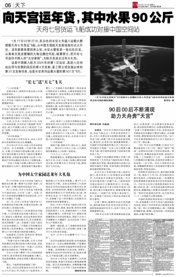 青年报记者 刘晶晶 本报讯 “2022年中国空间站全面建成,货运飞船也从一年两发变成两年三发,天舟七号是应用与发展阶段的第二艘货运飞船,装载了航天员在轨驻留消耗品、推进剂、应用实(试)验装置等物资。” 中国航天科技集团有限公司八院天舟七号试验队介绍道,“天舟七号已是第七艘货运飞船,我们依然按照首飞的标准开展各项工作。” 中国航天科技集团有限公司第八研究院承担了天舟货运飞船的电源分系统、对接机构分系统、推进舱结构与总装以及测控与通信子系统、总体电路分系统推进舱电缆网等研制任务。 此次天舟七号将对接于核心舱后向端口,首次采用3小时快速交会对接模式,为在轨航天员乘组闪送物资。作为交会对接的核心关键产品,八院研制的对接机构如今已圆满完成31次对接。从早期对接目标只有8吨到目前的180吨,每次满分对接的背后,都彰显着对接机构这一“金牌产品”的强大适应能力,进一步提高了空间站工程交会对接任务的可靠性。 记者了解到,随着空间站任务的建设,越来越多的90后00后出现在货运飞船研制装备的队伍当中,在各个岗位上发挥着重要作用。 1996年出生的马秀伟是推进舱总装设计,这是他第一次全程参与发射场任务,每当舱体有操作时,他都会紧跟现场,“总装工作要做到眼见为实,在现场实时对舱体状态设置进行跟进与确认,识别操作风险,更能够保证技术状态可控。”这个平时总是笑眯眯的帅气小伙子说起自己的工作一脸认真。 1991年出生的邢赛健,已经在飞行器总装岗位工作13年,“做对”“做好”“做细”,这是他对总装工作的自我标准。狭小的空间、密集的设备和电缆、连体的工作服,一工作就是几个小时……这是对体力和精神的双重考验,他依然坚持着自己的标准,一丝不苟。对自己的徒弟闫金超,邢赛健更是将自己的经验技术毫无保留地传授,帮助他成长。 同样是90后的张云开,是对接机构操作一岗,虽然才工作3年,但对接机构从零件到部件、从部装到总装,一张清晰的结构逻辑图早就深深地印在他的脑海当中。2002年出生的王奕程是试验队年纪最小的队员,第一次来发射场参与靶场发射任务,稚嫩的脸上带着00后的朝气与自信:“我的任务就是问和学,这次我学会了,下一次我就可以更加熟练。” 对接机构测试是发射场工作的重要一环,张瑞雄第三次作为货运飞船试验队员进场,测试工作对他来说已经是轻车熟路,“每一项口令的精准确认,每一项数据的清晰判读,是精心完成好每一项测试的基础,丝毫不能含糊。”