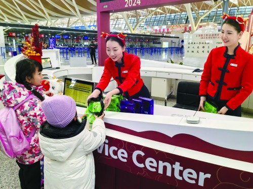 2024年春运从今日起正式启动。春运期间,上海两大机场将为旅客提供哪些便捷、温馨的服务?昨天,青年报记者现场走访浦东、虹桥机场发现,针对今年春运探亲流、学生流、旅游流为主,补偿式探亲流、老弱病残孕等特殊旅客有所增加等特点,两大机场都推出了“首乘服务”,为首次乘坐飞机的旅客提供细致、便捷的服务。 青年报记者 刘春霞 预计春运客流基本恢复至2019年同期水平 昨天上午10点30分,浦东机场T2航站楼B岛南航值机柜台前,等待值机的旅客已经排队绕了好几圈。记者注意到,虽然春运还没正式开始,但候机楼内的“人气”明显已经高涨。 “今年春运期间,预计浦东机场执行航班5.6万架次,进出港旅客773万人次,日均航班量达到1413架次,日均旅客将达到19.3万人次。国内出行的热点航线主要是哈尔滨、长春、沈阳、重庆、昆明等;国际航线加班的热门方向主要是日本、韩国、新加坡及东南亚等。”浦东机场运行指挥中心副主任张瑞甲介绍,根据预测,上海机场春运客流高峰期节前为2月7日至9日,返程高峰为2月16日至17日。为了应对客流高峰,机场方面采取了不少优化措施,比如值机柜台采取早开放、错时增开等措施,安检勤务组织也进行了优化,“总体来说就是减少旅客的排队时间,为旅客安全顺畅出行做好服务保障。” 下午1点30分左右,虹桥机场T2航站楼内也是人头攒动,各个值机岛的柜台前都排了不少旅客。“得益于各类政策的影响,今年春运旅客的出行需求将明显提升,虹桥机场春运期间的航班量预计将达到3万架次,客流量达到520万人次。”虹桥机场飞行区运行指挥中心值班经理潘竣透露,在航班高位运行的情况下,为了确保旅客服务质量不下降,虹桥机场在运行决策上持续开展机位动态化研究,结合今年春运的特点,利用人工智能开展动态分析,辅助决策,提高航班的正常性、廊桥的利用率和航班的靠桥率,为旅客出行提供更为舒适便捷的出行体验。 记者采访了解到,随着旅客出行需求的持续增长,以及国内外航空运输市场的恢复,截至2023年底,上海机场国内(含港澳台)通航点达到175个,国际通航点达到103个,分别恢复至2019年的102%和73%。今年春运期间,两场的航班量、客流量预计基本恢复至2019年同期水平。 首乘服务让旅客出行更便捷、更温馨 昨天上午11点左右,浦东机场T2航站楼出发层旅客服务中心柜台前迎来了前来问询的一家四口,得知他们是第一次乘飞机出行,柜台服务人员谷培华为两个孩子送上了“申情初行”口袋包。 “口袋包里有我们附送的机场服务手册,这个手册涵盖了旅客的出行提示、出行流程和航站楼内一些服务设施的方位,以及爱心服务的预约方式,可以让旅客‘一册在手,乘机不愁’。”浦东机场航站区服务管理科科长蒋巍现场展示说,这是今年春运推出的一个重要服务举措,除了给首乘旅客的绿色“申情初行”口袋包,还有给无陪老人提供的紫色“申情相伴”口袋包,“只要旅客佩戴了这样的口袋包,工作人员立刻就能知道这是首乘旅客还是无陪老人,随后就会主动提供一些帮扶服务。” 而在虹桥机场,“首乘手环”也实现了问询柜台和航司柜台全覆盖。虹桥机场航站区服务规划部科长沈岚介绍说,针对第一次到虹桥机场乘机的旅客,机场方面设计了一条绿色的首乘手环,佩戴这条手环的旅客将在问讯、安检、值机等环节得到更周到、更细致的服务。 记者注意到,为了迎接春运客流高峰,虹桥机场两座航站楼的出发层已经增设了流动问讯岗,每天从早上7点到晚上7点提供最贴近旅客的问讯服务。同时,候机楼的温馨通道和高铁、地铁共同打造的空铁地服务品牌,也将在春运期间加强联动,共同做好针对特殊旅客的服务联动。 虹桥机场再添一条“易安检”通道 春运期间客流量增多,为了给旅客提供更高效的安检服务,虹桥机场在现有T2航站楼32号“易安检”通道的基础上,1月26日起,将在T1航站楼的9号安检通道再增加一条“易安检”通道。 “同时,我们也同步上调了每日预约人数的上限,旅客可以在航班起飞前48小时内,通过支付宝内的民航公安服务易安检小程序提前进行预约,或者到了现场通过扫码方式预约。”虹桥机场安检运管中心信息部经理熊瑜介绍说,符合条件且预约成功的旅客,可以凭易安检通行码由专用通道快速过检,“相比其他安检通道,过检的效率可以提高20%左右。”