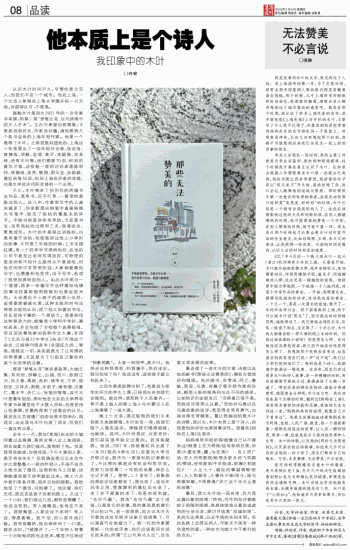 □项静 我是先看到木叶的文字,再见到这个人的。来上海读书的第一年,为了打发时间,经常去图书馆宽阔人稀的报刊阅览室翻看杂志报纸,那个时候,几乎上海所有的报纸和时尚杂志,我都喜欢翻看,潜意识里大概有想跟这个城市靠近的意思吧。就是在那个时期,我记住了很多上海作家的名字,其中就有在《上海电视》上写专栏的木叶,文章写了什么我不记得了,印象深刻的是经常看到他和走走的名字排在同一个版面上。时间真是神奇,无论几次回想起那个时刻,我都不可能想到后来我们会成为一起上班的同事和朋友。 毕业之后很长一段时间,我的主要工作就是负责会议签到、发材料和联络媒体,这个时候我才算是真正认识了木叶。比如我会根据工作需要要求木叶做一些配合之类的,他的态度让我非常震惊,他回答的句子是以“我从来不”开头的,虽然拒绝了你,但只会让人敬佩他的坦诚与原则。那时候我才第一次意识到世界的参差,在我还对世界只能回复“是是是、好好好”的时候,木叶已经是一个拥有自我规则的人了。这些应该都影响过他的文风和判断标准,在别人揶揄嘲讽的时候,他可能真诚地赞美一个作家,在别人赞美的时候,他可能不置一词。我也是从那个时候起才认真去看木叶对作家作品的专业意见,比如对韩寒、王朔、朱天文的看法,让我获得一些启发。从前的时间是慢的,认识之后的时间却是加速度。 2017年4月的一个晚上跟木叶一起从(浙江)杭州乘夜火车回上海。从落座开始,木叶就开始跟我聊文学,他声音特别大,急切需要回应,环视周遭刷手机、嗑瓜子、闭眼酣睡的人群,这注定是一趟尴尬的旅程。他按照中国文学地图,一个地域一个人地问我,对某个作家作品的看法。一开始,我硬着头皮,搜肠刮肚地组织语言,谈谈我的某些看法。一个又一个,真是一次漫长的旅途,像开了一年的作品研讨会。好不容易熬到上海,终于可以跟木叶说“再见”了,因为抵达的时间特别晚,地铁停运了。我们被迫去排队打车,队伍一眼望不到头,足足等了一个半小时,木叶的大脑像齿轮一样又滑到刚上车的时刻。你读过谁谁谁的小说吗?你觉得怎么样。有时候他还没等我回答,就已经开始谈论他觉得怎么样了。我想跟那个夜晚坐在旁边、站在前后的旅客朋友们说一声“对不起”,我们让文学打扰到他们了。想到他是个诗人,我脑海中就涌出一堆故事。这些年,朋友们讲过很多木叶的诗人故事,在一些微醺的时刻,有些故事情节我统计过,黄德海讲了大概一百遍了。哪些是真的哪些是假的,谁能分得清楚呢,谁愿意去分辨呢,听之任之吧。我应该是在某个无聊的时候,翻到过《妈妈在上海》,他有很多睿智的诗歌和见解,我独独无法忘却这一首,“妈妈将房间收拾得,就像自己从不曾来过”。他若无其事地叙述着妈妈在东方明珠、医院、人民广场、教堂,每一个场面都像一根刺扎进混沌的世界,让人有一瞬间惊觉,脊背一凛,这就是我日日面对的世界和人生呀。木叶的诗歌,以及他的《那些无法赞美的》,以及茶余饭后的轶事,加起来几乎可以组织出他的一份小传了,朋友们都有自己的版本。可是,太多事情,无法赞美,不必言说。 张定浩经常提醒我注意木叶的服装。夏天是粉红色T恤,冬天几乎每次吃饭都能看到粉红色毛衣和橘红色羽绒服,即便是在夜间也清晰可辨。木叶当然也穿其他颜色的衣服,出镜率最高的就是这三件。木叶是个“心机boy”,他知道岁月苦索如寒冬,而红色是冬天里的一把火。 兴安,文学评论家、作家、水墨艺术家。著有散文集《伴酒一生》《在碎片中寻找》,近年主要从事自然生态文学的写作、评论和研究。 项静,评论家,作家,现就职于华东师范大学中文系,著有《清歌》《集散地》《韩少功论》等。