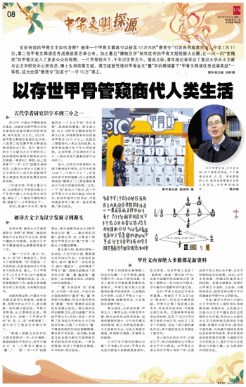 玄妙奇诡的甲骨文字如何考释?破译一个甲骨文最高可以获奖10万元的“悬赏令”引发各界高度关注。今年1月11日,第二批甲骨文释读优秀成果获奖名单公布。加之最近“博物汉字”制作发布的甲骨文短视频火出圈,让一闪一闪“变精灵”的甲骨文走入了更多公众的视野。一片甲骨惊天下,千年汉字贯古今。值此之际,青年报记者采访了复旦大学出土文献与古文字研究中心研究员、博士生导师蒋玉斌。蒋玉斌曾凭借对甲骨金文“蠢”字的释读拿下“甲骨文释读优秀成果奖励”一等奖,成为全国“悬赏令”的首个“一字10万”得主。 青年报记者 刘昕璐 不少甲骨文字,只可见字形,但不清楚其构造,不了解确切的音、义、用。学者要做的工作,就是全面搜集并分析已知信息,为考释创造条件。——蒋玉斌 五代学者研究识字不到三分之一 2016年,中国文字博物馆发布通告,对破译未释甲骨文并经专家委员会鉴定通过的研究成果,单字奖励10万元。2023年,经甲骨文释读专家委员会评审,入选第二批征集甲骨文释读优秀成果的共5项。其中,复旦大学出土文献与古文字研究中心陈剑教授和谢明文副研究员分别荣获一等奖和二等奖,加上首届拿下“一字10万”的蒋玉斌研究员,让复旦大学出土文献与古文字研究中心成为目前获得甲骨文释读优秀成果奖最多的科研机构。 120多年前,甲骨文重见于世,以成熟的文字系统勾勒出三千年前中国上古社会的生活风貌,确证了一个真实可循的商王朝,被誉为“一片甲骨惊天下”。 然而,跨越千年时空,要想做到对一个古文字的“完全考释”,是极难的事情。蒋玉斌介绍,自从1899年王懿荣发现甲骨文以来,学者探查到存世的商周甲骨在16万片以上,这是后人管窥商代人类生活的线索,也是学者追溯中华千年文明的拼图。这些甲骨,已发表的8万多片,上面共发现不重复的单字近4000个。 迄今,已有五代学者前仆后继不断地进行研究,识字大约是1160个,不到三分之一,仍有2000多字有待破解,但大多都是难啃的“硬骨头”了,面临着既复杂又不成文的破译阻碍。“比如,一个‘酉’旁加几个斜点,这个字在甲骨文中出现次数达2000多次,虽然学者对它的用法、可能的读音有所了解,但一直未有确释。”蒋玉斌说。 破译古文字为汉字发展寻到源头 在学术界,破译古文字通常被称为“考释”或“释读”,就是把那些不认识的文字认出来,把读不懂的文句读通。这是古文字学中最基础却也是最具难度的工作。 了解一个汉字,要从“形、音、义、用”四个维度进行。形音义三者易理解,“用”则是指一个字的职能,在具体使用时又可能有不同的用法、意义。不少甲骨文字,只可见字形,但不清楚其构造,不了解确切的音、义、用。学者要做的工作,就是全面搜集并分析已知信息,为考释创造条件。 回顾考释过程,打通关节的关键证据往往较隐秘,细致观察、周密分析必不可少,甚至需要一些机缘才能发现。甲骨文考释难,也主要难在这里。蒋玉斌认为,如果一个甲骨文字的“形、音、义、用”全都清楚了,就可说它已被完全考释出来了。 “殷墟卜辞数见用在作乱方国名称前的一字,旧无确释。根据细致的字形对比,该字可确认为‘屯’,主要用为蠢动之‘蠢’。”……获“一字10万”的悬赏时,蒋玉斌撰写的论文《释甲骨金文的“蠢”——兼论相关问题》,就是从形、音、义等多个角度对甲骨金文的“蠢”字第一次做出了完整的解释。 蒋玉斌介绍,商周时期有一些动乱、不安分的方国,需要通过征伐加以平定。“比如动乱的夷方,就叫‘蠢夷方’;动乱的盂方,就叫‘蠢盂方’。这样释读了甲骨文‘蠢’,顺势也就解决了西周金文的‘蠢’,像‘蠢淮夷’‘蠢猃狁’,这些都是先动乱、后被征讨的方国部族。” “‘蠢’本来就有‘动’的意思,古代把一些动乱、不安分的方国部族称作‘蠢邦’等。‘蠢’带有贬斥的意味,现在大家所常用的‘愚蠢’‘笨拙’等意思其实是后来发展出来的。”蒋玉斌用这样的解释方法,成功读懂了有关的甲骨文句,同时,还进一步考释了西周金文和传抄古文中的相关形体,打通了之前因为“蠢”字释读受阻而形成的理解障碍,解决其中存在的一些问题,并提高这些反映王朝与方国部族关系的材料的利用效率。一系列的释读,形成了完整的证据链,环环相扣,相互验证。 甲骨文内容绝大多数都是新资料 甲骨文和铸刻在青铜器上的金文同属一个文字系统,都是早期汉字,但由于使用场景、书写工具和书写载体等因素而各具特点。甲骨文是目前人们能看到的最早的成体系、大规模的汉字资料,出现于甲骨占卜这一特殊情境,就载体而言,大多是刻在坚硬甲骨上。 蒋玉斌说,从研究来看,甲骨文占卜事项众多,内容非常丰富,例如战争的过程和结果、奴隶的管制和逃亡、天气对农事活动的影响、商王对贵族的委派、天文现象的吉凶,以及生育是否顺遂、疾病能否痊愈、田猎有无收获等。 古书中关于商代的确切记载十分有限,可以说,甲骨文的这些内容绝大多数都是新资料,弥足珍贵。如在甲骨上发现了“星率西”(星星一律向西)字句,这是中国最早的流星雨记录;有些卜辞附记一旬内的天气情况,亦可看作中国最早的气象记录。 此外,甲骨文的证史作用非常重要。商朝见于司马迁《史记·殷本纪》,但在近代颇受质疑。甲骨文记载了很多商王的名号,有些名号成序列