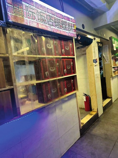 国际饭店蝴蝶酥(上海总店)的位置则像网友先前所描述的一样——离了大谱。该店位于静安区天目中路某商厦一层底楼后门处,门口正对的是电动自行车停车棚,停车棚后面是一堵围墙,墙的另一边则是老上海人熟知的“老北站”,头顶则时不时有轻轨3、4号线呼啸而过。