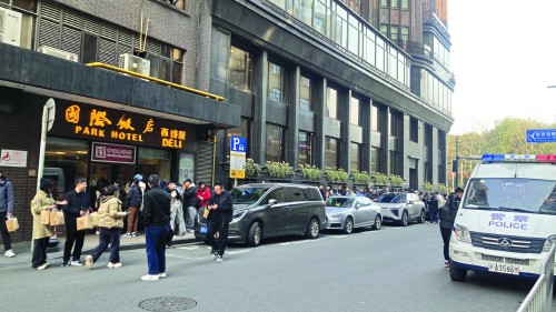 3月12日16时左右,国际饭店帆声西饼屋门口购买蝴蝶酥的消费者队伍排到黄河路与南京西路路口处。西饼屋的马路对面停有一辆警车,黄河路和凤阳路交叉路口处有几名交警正在执勤。
