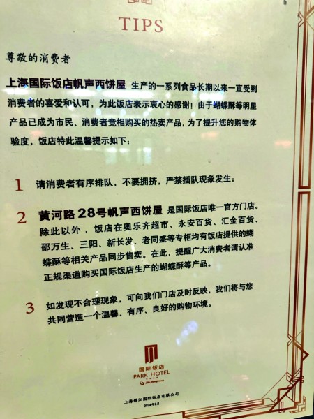 “春节期间动辄排4小时,非高峰日排1小时也是常态,想买上几包尝尝鲜真的太难了。”上海知名网红产品——国际饭店蝴蝶酥随着前段时间《繁花》的热播,再次人气暴涨,来自全国各地的游客一窝蜂地挤到黄河路28号国际饭店帆声西饼屋门口排队。