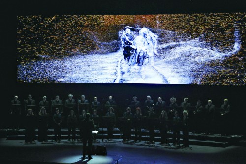 现场的一切也都会被即时分析处理,以数据方式“入画”。演出时,舞台后方放置了两个呈V字形排列的巨大屏幕。梵高的《向日葵》《盛开的杏花》以及克里姆特的《吻》《贝多芬饰带》等观众熟悉的画作在屏幕上接续呈现。这些画作与从现场收集到的实时数据相结合,以连续、缓慢的动画形式展示在观众面前。实时数据包括了演员和指挥的表现,舞台上32名荷兰室内合唱团成员的表现通过麦克风及皮肤电反应传感器进行捕捉;而指挥的动作与面部表情也被分析并插入到视觉呈现中。这种独特的呈现方式使得每一场音乐会都成为了一件原创的、独一无二的艺术品。