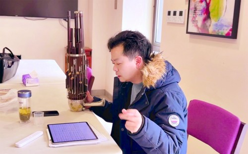 民族乐团笙声部首席赵臻在研究AI作的曲子。