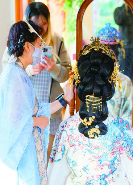 对镜理鬓贴花黄,人面桃花粉黛妆。 随着汉服文化体验场景的愈发多样,人们对汉服妆造的需求正在日益加大,汉服妆造师这一原本有些冷门的职业也随之兴起,这个职业的状态究竟是如何的?会不会是青年下一个择业新风口呢? 青年报记者 杨力佳 依旧小众 需求升温 “一个独立汉服妆造师做一个造型平均需要两三个小时。虽然是在旺季里,但是一天场子赶下来,最多也就做两三个造型。从整个化妆行业来看的话,汉服妆造依旧是小众门类,无论是从单价上还是数量上。” “啊呀,客人已经晚了快20分钟了,我下午1点还有一个妆要画,时间有点紧张哎。” “没关系,今天这个客人之前预选了一套明制汉服,搭配三绺梳头,这个难度对你来说驾轻就熟,抓紧点时间应该够。” 工作日上午,当记者来到位于创享塔的明熙传统汉服礼服馆,正好撞见主理人曹懿蓉和汉服妆造师伊娃的这段对话。 伊娃告诉记者,现在正值踏青季,有越来越多的年轻人会选择穿着汉服去诸如顾村公园、辰山植物园这样的景点拍写真,对汉服妆造的需求比平时多了不少。 “一个独立汉服妆造师做一个造型平均需要两三个小时,所以,虽然是在旺季里,但是一天场子赶下来,最多也就做两三个造型。我工作8年,从整个化妆行业来看的话,汉服妆造依旧是小众门类,无论是从单价上还是数量上。而且,除非是铁杆的汉服爱好者,也就是汉服圈里的人,否则随着旺季而来的一时兴起的客人,复购率是偏低的,这也在一定程度上决定了汉服妆造从业者在总量上的相对平稳。” 入门容易 精通很难 “你看得出哪件是唐制汉服,哪件是宋制汉服吗?举个例子,就拿花钿来说吧,许多客人都非常喜欢,但是究竟选哪一种也是非常讲究的。这些都是我们需要用专业的知识和审美,与客人沟通细节,如果张冠李戴就要闹笑话了。” 以明熙传统汉服礼服馆为例,主理人曹懿蓉向记者透露,这里的妆造收费标准为500元1次,婚礼跟妆3688元1天,属于中档水准。这个90后女生毕业于上海大学历史系,开出了这家传统汉服礼服馆。在她看来,要做一名合格的汉服妆造师,熟悉汉服在各个朝代的不同款式以及与之相应的妆容特色是最基本的自我修养,否则就很容易将汉服穿成“四不像”。 说着,曹懿蓉随手拿起了两件汉服:“你看得出哪件是唐制汉服,哪件是宋制汉服吗?举个例子,就拿花钿来说吧,许多客人都非常喜欢,但是究竟选哪一种也是非常讲究的。唐朝时,花钿的发展进入了鼎盛时期,五颜六色啥材质都有。而宋朝妇人的花钿相比唐朝的更为简约,用珍珠作为替代,这里有一个冷知识是:当时的珍珠其实要比金银要贵。这些都是我们需要用专业的知识和审美,与客人沟通细节。无论是服装还是妆容,都是与历史背景和审美意识紧密相连的,如果张冠李戴就要闹笑话了。” 曹懿蓉表示,最近随着汉服的升温,不少人觉得这是一个新的赛道转行过来做汉服妆造师,入门容易,但精通很难,所以需要不断地去学习,去精进。在她的案几上,一直摆放着几本介绍中国历代女子妆容的书籍,随时翻阅,温故知新。 吸引青年 竞争激烈 “我们规定,最多30分钟内完成一个妆造。当时仅仅为了提速,我们就培训了半个多月。”“还是非常看好这个市场的。上海这里的客人宁可错过观看剧场演出,也要来亲自体验一下汉服妆造。” 关于这一点,一枝清涵工作室主理人一瓢聪也感同身受。当记者联系到她的时候,她刚刚结束一场汉服文化进大学校园的活动。她告诉记者,除了这类汉服文化知识科普讲座的需求量在明显增加之外,不少年轻人也开始对汉服妆造师这一职业产生了浓厚的兴趣。所以,她也正在准备开设相关的培训班,以15天为一个周期,从汉服起源开始讲起。为了保证教学质量,每期控制在10人左右。根据不同的授课方式和阶段设置,学费从400元-5000元不等。 “另外一个比较明显的变化是,已经有几家广告公司找到我,为他们拍摄的广告提供妆造支持,这在以前是比较少见的。” 一瓢聪表示,上海不像西安、洛阳这样的古都,本身就带有强大的流量,所以还是一个循序渐进的状态。虽然汉服的知晓度和接受度在普通民众中不断扩大,但是就汉服妆造师这个行当来说面临的却是竞争越来越激烈的买方市场,这种竞争更多的是来自在不同维度上的比价。 90后山西女生思雨是今年1月刚从北京来到上海的,是一家沉浸式汉文化美食剧场的专职汉服妆造师,主要的工作是为前来用餐的客人提供汉服妆造服务。“除了周一不提供午餐场次之外,其余每天提供午餐和晚餐各1个场次。我们这里一共有8位妆造师,平均下来每场每人要为10个客人做汉服妆造。” 思雨说道:“我们规定,必须在20分钟,最多30分钟内完成一个妆造。当时仅仅为了提速,我们就培训了半个多月,即便大家都已经是有一定经验的汉服妆造师了。” 记者上网查了一下价格,以晚餐为例,团购价为698元/位。而汉服妆造服务是需要额外收费的,分为100元和200元两档。因为时间所限,思雨她们给客人化的基本上以古风淡妆为主,客人对妆容的要求,好看多于复原,有时候也会遇见穿着宋制汉服要求画唐朝侍女妆,将朝代混搭的客人,每次遇到这样的情况,妆造师会友情提醒,耐心引导,当然,最后是否采纳还是看客人的喜好。 当记者问思雨为何会放弃在北京3年的积淀选择南下的时候,她表示:“还是非常看好这个市场的。有时候