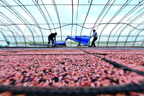 近日,“大粮仓”黑龙江垦区各地陆续开展水稻播种作业。在位于黑龙江省双鸭山市的黑龙江北大荒农业股份有限公司友谊分公司,10668栋集中水稻育秧大棚中的水稻播种作业有序推进,这些稻种经棚内育秧后,将应用于56.78万亩水田的水稻插秧作业。图为农业职工在水稻育秧大棚里进行播种后的覆土作业。