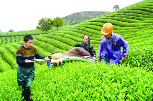浙江省武义县壶山街道正新屋村茶农用采茶机在茶园赶采春茶。