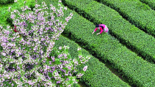 近年来,余庆县把发展茶产业作为县域经济的支柱产业,采取扩大种植面积、引入加工企业、延伸产业链条等举措,助力乡村振兴。截至目前,余庆县有茶园面积21.3万亩,茶产业已成为该县乡村振兴的支柱产业,8万多村民因茶兴业、因茶增收。图为村民在贵州省遵义市余庆县松烟镇二龙村茶场采摘春茶。