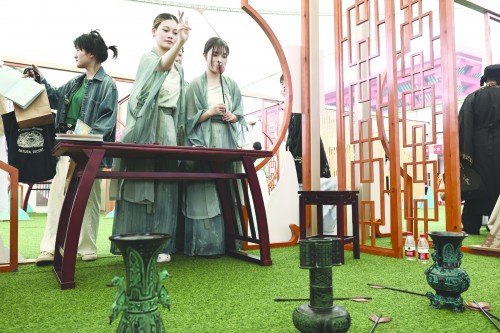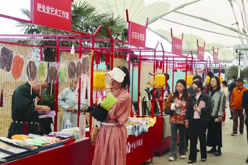 沪上繁花似锦,华服如诗如画。4月11日至4月14日,2024年“中国华服周·沪上繁花”系列活动在上海举行,华服巡游、国风市集、中华文化展演、华服韵典,一系列活动为华服爱好者带来丰富体验。 作为华服周系列活动之一,4月11日至4月14日,国风市集在世博源限时开启。现场不仅可赏传统服饰,体验非遗工艺,国风市集还设置了中华文化展演区,邀请沪上各高校相关社团等带来国风演出。 青年报记者 周胜洁 赏 复原明代宽袖褙子女服 映衬着中华艺术宫,国风市集“中国华服周”字样前,身穿华服、戴着精致头饰的小姐姐们甩袖转圈,留下婀娜倩影。市集摊位错落排开,展示精美华服、国风文创、非遗工艺等。 一套明代的绘有缠枝牡丹纹样的宽袖褙子女服放置在国风市集中东华大学上海汉服版权中心摊位前,这件以红色为主色调的复原品遵循了“图像为证、文字溯源、证源造物、创新复原”的工作原则,以明代女装为蓝本,进行了明代汉服的复原性创作,再现了那个时代的服饰风采。 东华大学上海国际时尚科创中心青年教师蔡钰茹介绍,在中心成立之初就已经完成了从先秦到明清的25套中国历代女性服饰的复原。“这次带来的宽袖褙子女服绘有缠枝牡丹纹样,也应景了中国华服周‘沪上繁花’的主题。” 精美的华服吸引了外籍青年的目光。95后印度留学生泽仁很喜欢中国传统文化,2020年第一次在昆明参加华服活动后,他就喜欢上了。目前泽仁是上海戏剧学院跨文化专业研一的学生,得知世博源有国风市集,他叫上了同班同学鲁洁,一名来自白俄罗斯的姑娘。他们身穿华服,流连于各个摊位前,在这套展示的明代宽袖褙子女服前,他们看着花纹啧啧称奇。 展位上的文创也充满吸引力。帆布包上的图案灵感来源于“山海经”的瑞兽,“宋韵鸣香”系列文件夹则以宋徽宗的花鸟小品为灵感,将宋代文化的韵味融入产品中。蔡钰茹表示,这些充满中国传统文化元素的文创来源于去年举办的首届中国高校原创时尚汉服设计群英会,由创意稿件转化为文创产品,在国风市集与华服爱好者见面,也让传统文化在日常生活中焕发出新的光彩。 感 体验舞彩带龙、马桥文化 马桥手狮舞、金山土布、三林龙狮、颛桥剪纸……这些各具特色的非遗项目都能在国风市集上看到。 一条蓝色的五节龙“躺”在三林龙狮摊位一侧,桌上还有两条供一人舞的彩带龙。身穿铠甲来到国风市集的小陈对舞龙产生了兴趣。“我们三林镇是中国龙狮运动名镇,如今的舞龙已经和狮舞、云牌舞、鲤鱼灯等形式结合,表演形式上也有百米巨龙、布龙、夜光龙、单人龙等。”上海三林龙狮队95后队员徐哲锴介绍道。现场他还教小陈如何舞彩带龙,“一手拿着龙头的绳子,在身体两侧或头顶上画圆圈。”随着徐哲锴有力的动作,彩带龙随风飞舞,颇具观赏性。 古称“筠绣”的三林刺绣有近八百年的历史。三林刺绣摊位上,含有精致刺绣的手机包、口罩、手帕、书签铺陈开来,特别一款围巾上绣的花朵,用到了“抽、拉、雕”技艺,“三林刺绣是一种用绣针引彩线,按设计的花纹在纺织料上刺绣运针,以绣迹构成花纹图案的传统民间手工技艺。它包含70多种工艺、130多种针法。”三林刺绣传承人周老师介绍道,现场还可以用插针手法刺绣“福”字。 马桥镇文体中心文博科负责人贾雪则说起马桥作为“上海之本”的历史渊源和马桥文创产品的故事。“习近平总书记指出,文化产业既有意识形态属性,又有市场属性,所以诞生了马桥的五个系列的文创产品,分别是马桥古文化系列,董其昌系列、紫藤花系列马桥手狮舞系列以及土布系列、让马桥文化成为了‘带得走的马桥文化符号’。”编撰《马桥文化系列读本》,开设体验营,一系列针对青少年的文化宣传活动也让马桥文化得以传承。 “金山共有60项非遗,这次为国风市集带来4项非遗和国风手作,包括土布包、盘扣作品、剪纸作品、钩针玩偶和原创国风首饰。”金山区非物质文化遗产保护中心助理馆员崔竫然介绍道。在金山,青少年也有各种平台了解非遗,“孩子们通过非遗进课堂、跟着非遗去旅行暑期亲子夏令营等,了解土布贴画的发展历史、艺术价值和制作过程。” 玩 集章、互动增加趣味性 国风市集里最有趣味性的无疑是打卡互动。互动体验区共有七个展位,可参与棋艺、投壶、书法、纂香、茶艺、灯谜、对诗等互动。 在服务台领取了“中国华服周”集章册后,身穿宋制汉服的小王第一批体验完七个展位,还换取了国风小礼物。这名大四学生和同学4月9日从浙江到上海,开启毕业旅行。出发前得知有国风市集,她俩带了全套装备而来。六年前,小王已入了“汉服坑”,平时多穿宋制、明制的汉服,她喜欢参加国风市集,不仅能遇到同好,还能买到漂亮的服饰配件。 智能中医脉诊、血压健康评估、心脏健康评估、脑健康评估……在国风市集“太医诊室”摊位前,把脉问诊也有新科技,“华服太医”引导华服“小主”体验四个健康检测项目。其中,脑健康评估仅需90秒即可快速评测高发脑疾病健康风险,将手掌伸入智能中医脉诊设备中,1分钟便能号脉问诊。每个项目几分钟就能完成,并能即时出具综合健康评估报告。 现场负责人介绍,太医诊室包含的线上服务还可以提供快速问诊和健康咨询,能让企业员工快速完成慢病、健康等咨询,通过持续互动,成为自己的第一健