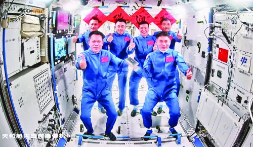 据中国载人航天工程办公室消息,在载人飞船与空间站组合体成功实现自主快速交会对接后,神舟十八号航天员乘组从飞船返回舱进入轨道舱。北京时间2024年4月26日5时04分,在轨执行任务的神舟十七号航天员乘组顺利打开“家门”,欢迎远道而来的神舟十八号航天员乘组入驻“天宫”。随后,两个航天员乘组拍下“全家福”,共同向牵挂他们的全国人民报平安。