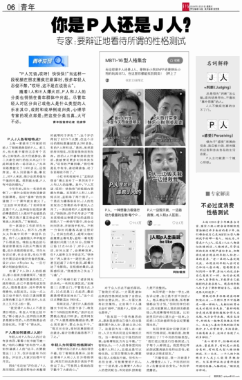“P人咒语:哎呀!快快快!”当这样一段视频在朋友圈疯狂刷屏时,很多年轻人忍俊不禁,“哎呀,这不是在说我么”。 随着I人和E人爆火后,P人和J人的分类也悄悄在青年群体中兴起。尽管年轻人对区分自己或他人是什么类型的人乐在其中,或附和或举例或归类,心理学专家的观点却是:把这些分类当真,大可不必。 青年报首席记者 范彦萍 名词解释 J人=判断(Judging) 总是预先“判断”怎么做,崇尚结果导向、不喜欢“意外惊喜”的人。 J人不做规划真的出不了门。 P人=感受(Perceiving) 倾向于“感受”周围的信息,适应能力强,崇尚随机应变和自由自在的生活态度。 P人主打就是一个随心所欲。 P人J人各有啥特点? 上海一家读书工作室的创始人丁智刚是典型的P人。前几天,他无意中看到北京有个活动,立即报名,当天往返参会,第二天家住闵行的他又风尘仆仆赶到浦东的一场活动上。“光来回路费就花了1000多元,还很奔波。有人问我值不值,事实上,对P人来说,很少会思考值与不值的问题。想到就去做,P人有冲动的倾向。” 今年年初,因为一名讲师病倒了,一家外企临时找他顶替讲创新课程。临时“接单”的他快速做了一个课件就去救火了。“企业的HR对我说,‘丁老师你肯定是个P人,这种临时找我讲课的事是我们J人绝对不会接受的事。’那天我才真正体会到了这两类人的差异。”丁智刚说。 在一家国企工作的邓先生则是十足的J人。前不久,他携太太和高中同学一家组队出游。四个J人提前很久早早做好了行程规划。唯独去海边的行程安排要视当天的天气情况调整,没办法提前做安排。邓先生告诉记者,在企业里,他也习惯在开展活动时做好完备的预案,设计plan A和plan B。一旦打破计划就会很扫兴。 在看了P人和J人的视频后,靳小姐有点模棱两可,“感觉P人和J人的属性我兼而有之。”她形容说,自己不是很有规划性的人,很容易变卦;对外界具有探索性,比较灵活。从这一点上自己似乎很P,但自己遇到需要决策的事又会三思而后行,从这点上又不乏J的一面。 “我觉得P人和J人不是泾渭分明的。有些人可能比较中性。”靳小姐认为,这样的分类更多是娱乐性的,人的性格是会动态变化的。不要“卡”得太死。 P人是如何逼疯J人的? 年轻人对P人和J人的讨论有多热烈,看看小红书就可窥一斑。“咕叽小蘑菇”发布的“P人是如何逼疯J人的”帖子,点赞数高达11.1万,仅评论就有7500多条。评论区,大家讨论得不可开交。 网友“毛坨怡”评价说,“P人房间很乱,但是你帮他分类整理好就等同于弄乱了”,这个评价得到了8219个点赞,仅这个评论的跟帖数量就高达280多条。有的P人附和说,“是的,虽然我的房间很乱,但我能很快找到东西。我的J人外婆帮我收拾完后,我就要花更多时间来找东西。”还有的严重同意,“我们那是乱中有序,谁动跟谁急,动了东西都找不到了。” 小红书和视频号上“孟阳话很多”博主发布了一系列关于P人和J人的故事。其中,“P人咒语:哎呀!快快快”的视频内容颇为有趣。在形容P人和J人的特点时,孟阳举了两个例子,一个是在为播客取名时,J人的他发现自己想要的名字被别人占用了,一旁的搭档P人超哥催他说,“快快快,你手机号多少?”原本还想经过审慎评估的孟阳立即陷入了一种快节奏中,完全没时间思考,开始报手机号。不到一分钟时间播客名就注册好了。在回去的路上,超哥又临时起意要去看电影,孟阳一看电影播放时间是12点55分,但眼下已经12点44分了,对于J人来说,时间太紧了,会果断放弃。但P人超哥立马开始念咒,“快快快!”两人骑车+一路狂奔,途中甚至赶超了2名外卖员,踩着点进了电影院。在视频的最后,孟阳感叹说,“我感觉自己失去了‘J魂’。” 这个视频引起了诸多网友的共鸣,一名网友调侃说,“如果我11点要出门,不管我8点、9点、10点还是11点起床,最后都是慌慌张张地出门。”这个点评点赞数高达3900多。 有网友说,“我们P人真的很擅长卡时间,但是卡多了,难免有个50%的迟到率吧。”该评论点赞数也高达2300多。还有网友说,“P人就是越酝酿越会鸽,要么现在就干,要么永远不干。”“每次出去玩,临时起意就能说走就走,越计划最后越容易不了了之。” 年轻人为何爱玩性格测试? 尽管对自己的P人身份深信不疑,但丁智刚还是表示,没有必要将P人和J人区分得很明显,网友们如此热衷分类似乎有些过了头。“可能网上极端的段子戳中了大家的心。” 对于众人乐此不疲的原因,丁智刚分析说,一方面是诸如此类的性格测试加强了自我认知和自我认同。另一方面又具有社交属性。比如两个P人遇见会打招呼,“我是P人,哎呀,你也是呀。” “我发现一个很有意思的点,原来我觉得自己很P,但当我遇到更P的人时,我就主动J化了。这是因为当一群人在一起时,人天生有共同适应环境的天性。当一种倾向过于强烈的时候,会朝着相反方向去平衡。”丁智刚认为,一个人的身体里同时住着P人和J人,且彼此是可以转化的。以项目管理为例,需要强J型人去做执行端。但作为一名创业者,可能需要前P后J。在一个团队里,也需要P人和J人的密切配合,否则团队拼图能力是不完整的。 朱同学是一名初一学生,她告诉记者,自己是不折不扣的J人。每天都会写日程表,所有事情都会写计划。“但和同学们相比,我只能算弱J,我的朋友都是强J,完成事情特别迅速。比如班里召开的心理