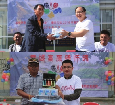 西藏,也许是许多人的向往,但西藏支教却是少数勇者才能做得出的决定,因为这并不是一场说走就走的旅行,在去之前就要做好充分的心理、生理以及物质上的准备。冈拉梅朵藏文化社的成员大多是藏族同学,很多人从小生活在条件比较恶劣的农村,他们通过刻苦学习以优异的成绩考进华东师范大学学习。他们远离家乡,然而无时不刻挂念那里的一草一木,并且立志要为家乡的教育事业作一份贡献,这份感恩之心正是这场支教活动的出发点。 六年的坚持 今年是华东师范大学“冈拉梅朵”藏文化社成员第六年赴西藏支教,从坚持了五年的山南地区转移到日喀则地区。从火车站出发沿着318国道开了半小时后,车子拐入一条小道,两边是绿油油的还未成熟的青稞和泛着金黄的油菜花。队员们无暇顾及这样的风景,只希望能快一些到学校。 今年支教的学校是副队长边巴琼达的母校——位于日喀则曲美乡的曲美乡中心小学。为了这次暑期的支教,边巴琼达在3月就与小学的老师取得联系,确定好了7月的支教。 为了更好地实现“藏区支教”,藏文化社支教队成员前后用了三个多月的时间筹备。藏文化社社长次仁更才说,资金是他们最大的问题,为了筹集资金,他们在华闵食堂前做了耐心的宣传,举行了两次西藏工艺品义卖,以及募捐活动。正是带着那么多人的支持与鼓励,六年来,这批由藏族、汉族、门巴族、白族等多个民族大学生组成的志愿者团队在每年的暑假一开始,便在江铁峰老师的带领下,乘坐从上海开往拉萨的T164次列车,历经48小时到达了神秘而又亲切的西藏。 爱与梦想的交织 蔚蓝的天空中飘着雪白的云朵,巍峨的雪山脚下流淌着一湾湾清澈的河水……“这就是美丽的西藏,连在大巴上随手拍下的风景都如此富有诗情画意!”队员们连声赞叹的同时,也开始了丰富多彩却也紧张劳累的支教生活,这其中有不少非藏族队员却因为初次来到高海拔地区而频现高原反应。“要撑下去,我们千辛万苦来到这里,不能就此趴下!”支教队员们在心中默念。 清晨6点,当太阳还未在海拔3565米的高原完全升起时,西藏自治区的孩子们开始了一天紧张的学习生活。“我们支教团队的到来对于这群小孩来说,仿佛是一阵喜悦而清爽的风”。也许是因为独特的教学方法和富有亲和力的讲课方式,所有的孩子都特别喜欢他们,校长也对前来支教的队员称赞不已。“同学们好!”“老师好!”这是支教队员益西卓玛的第一堂课,初上讲台的她未免有些紧张,声音里的颤抖连自己都能听得到,然而看到孩子们充满期待的眼神,也得益于之前对课程的精心准备,她很快平静了下来。朗朗的读书声开始在校园里回荡。 在队员的回忆中,比起与孩子们相处的快乐时光,刚来到藏区的高原反应,以及每天晚上结束一天教学之后还要因为备课、爱心物资分配等问题的操劳根本算不了什么。也正因为这样,当支教队员们即将踏上回程汽车的那天早晨,孩子们依依不舍的送别,他们眼里含着泪水,把洁白的哈达献给这群年轻的老师。在离歌声中,这场景永远定格在了每个人的心里。 在孩子们的眼里,这群来自于华东师范大学的大哥哥大姐姐不仅会上考试科目的课程内容,更会精心准备一些藏区的孩子们从未接触过的新奇课程。这不得不首推《梦想课》,在田园牧歌式的操场上,旁边的牛在悠闲地吃草,孩子们与老师围坐成一个圆圈,畅谈自己的梦想,支教队员还鼓励孩子们把自己的梦想写下来,贴在展板上,在这里最自然最宽阔的课堂中,孩子们一个个念头也犹如天际的飞鸟般划过长空,或许有些念头让人忍俊不禁,可是谁又会苛责他们呢?这正是一个让理想之花盛开的年纪。 “冈拉梅朵”在藏语中的含义是雪莲花。通过对冈拉梅朵藏文化社社长的采访,我们似乎能看到:当清脆的讲课声与读书声交织,当爱与梦想在支教队员与孩子们之间传递,当各民族的友谊在此交融,美丽的雪莲花不仅盛开在了雪域高原上,更向每一个人展现出了它的圣洁与光华。 每年,他们历经360小时,来到海拔4000米高原,长途跋涉4358公里,他们是上海市2014年社会实践最佳项目,他们连续四年前往美丽的西藏支教,他们长途跋涉,他们无怨无悔。他们,就是冈拉梅朵藏文化社。