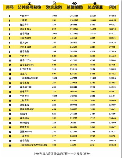活力永远是校园的特色,高校的团委充分利用校学生队伍,老师们与一群群充满创造力的学生创造一个个奇迹与惊喜。 华东政法大学团委的微信公众账号“华政青年”,在2016年共推出314期,945条资讯,新增关注用户37141人,阅读总量6025167人次,每一个人次都代表着大家对这个账号的喜爱和关注。 在坊间它还有个逗趣的昵称“十万+制造机”。十万+,作为当下微信阅读量的一个评判标准,往往代表着流行的一个层级,是热度最普遍的评判标准。而华政青年作为一个爆款文章的制造者,对于社会热点、校园趣味和学生需求,有着敏锐地捕捉和趣味精彩的呈现。 充满新意的师生们,总是给人小惊喜,比如让宿管阿姨脱下制服换上华服,瞬间,她们也成了女神,惊艳却不失温柔;又比如,华政李翔老师的一道司考练习题,因与当时王宝强离婚事件撞车而被称“华政神题”,微信图文一经推出,便引发热议。 “华政青年”新媒体核心成员近百人,包括采访、摄影、文字撰稿、编辑、美工等方面,团队成员都是由学生组成,各部门有专门的指导老师。这支分工专业的队伍,希望通过华政青年这一平台,将华政共青团工作,将华政人的正义、温暖传递给更多的人,让更多的人了解华政,了解共青团。 华东理工大学团委的账号“小花梨”,不仅名字可爱,更拥有可爱IP形象,并不断在文创产品上面做衍生。既有手绘平面形象,例如雷锋梨、志愿梨、红军梨、抗战梨、运动梨、学霸梨等,并且设计了很多手绘场景、表情包。还围绕小花梨的形象设计40余款周边文化产品,有文化衫、充电宝、蓝牙音箱、水杯、记事本、卡套、U盘等。 作为一个高校团组织的官方微信公众号,为学生成长成才服务不仅是职责,更是目标。微信查询功能是全校最全面的,从图书馆空座到天气,均可通过点击轻松获得。而新的一年度,以学生需要为核心的小花梨,还将和学校的信息化部门深入合作,对服务功能再次地进行升级,并同步改进原来用户体验不佳、操作繁琐的一些功能。进阶版的“小花梨”,在服务之余,也会更好地讲述青春故事,争取牢牢粘住自己的用户。 当我们告别 “单向灌输”的填鸭式宣传,变为“讲故事、诉情怀”,宣传理念也自然而然地转变为以受众为本、以内容为王、以服务为特色。正是这样的转变,大家总在细微之处体现人文关怀,运用图片、视频等展现方式,吸引着广大师生和校友,对母校所有的爱与眷恋,总能被公众账号的推送所触动,融为一次次转发,在朋友圈激起一阵阵回忆与自豪。