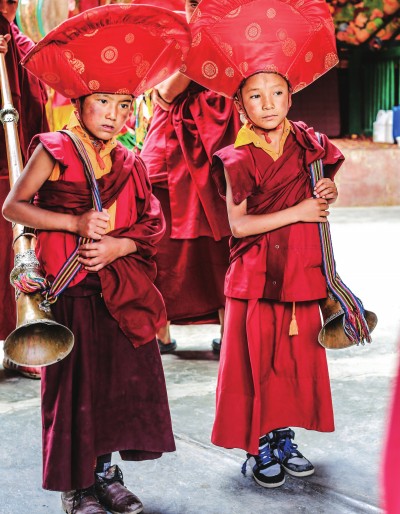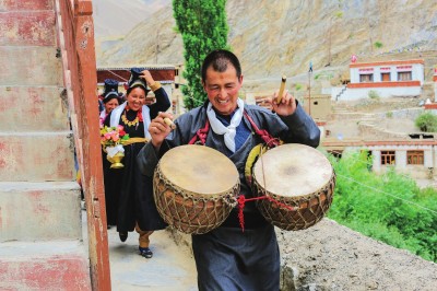 拉达克妇女的服饰和西藏札达人很相似,其头饰又兼具蒙古风貌。她们大方地任游客拍照,倒是大喇嘛向人群示意让出通道来,祈福的仪式马上就要开始。正午,鼓乐,喜庆。妇女们走在前头,手里提着花篮。喇嘛们队列整齐,吹着法号、敲击法鼓、叩响铜钹、撑着法盖,跟随在后头,绕行寺院顺时针一圈,缓缓向山下走去。