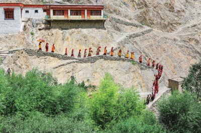 拉达克妇女的服饰和西藏札达人很相似,其头饰又兼具蒙古风貌。她们大方地任游客拍照,倒是大喇嘛向人群示意让出通道来,祈福的仪式马上就要开始。正午,鼓乐,喜庆。妇女们走在前头,手里提着花篮。喇嘛们队列整齐,吹着法号、敲击法鼓、叩响铜钹、撑着法盖,跟随在后头,绕行寺院顺时针一圈,缓缓向山下走去。