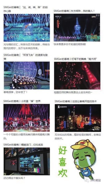 还记得读书时,开学的第一件大事吗?那就是回顾考卷,直面对与错,在答疑中拾遗补漏。无疑,春晚是电视人的大考,而在春晚之后的总结回顾,就如同分析答卷一样重要。 2017央视春晚,上海分会场导演组无数次“头脑风暴”,特效团队反复打磨视频特效,2000多名演职人员倾心排演。东方卫视中心、技术运营中心、东方明珠塔、广电制作、杂技团、幻维数码、小荧星、歌舞团等单位全力奋斗,一个又一个通宵达旦的不眠之夜最终编织了一个光情交汇的7分钟。 SMG青团便在春节假期后,火速出动,逐一与春晚各主创团队联系,反复沟通,摸索细节,将真实、生动的春晚故事一一呈现。 7篇微信与一场分享会联动,线上霸屏传播,将台前幕后的故事、主创们反复琢磨的心路历程,淋漓尽致地展现; 线下深入对话,启迪SMG员工们的思考,在业务成果巩固沉淀的同时促成更多的创新思考、专业探索及跨界合作。正如同这个系列的名字一样,一切“未‘晚’完待续”。