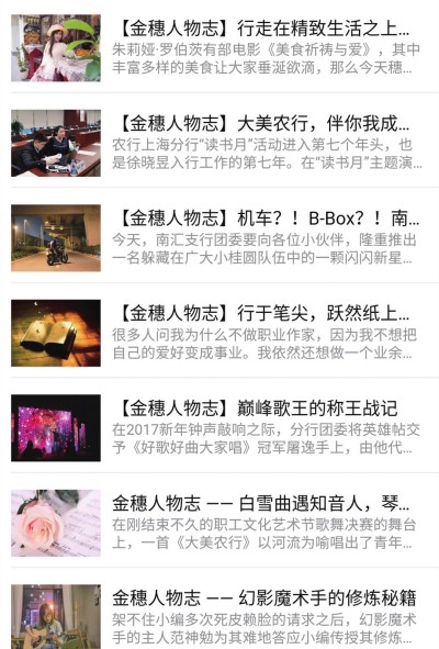 金穗青春,是农行上海分行团委微信平台,2016年1月上线,完全由青年员工自己采稿、编辑制作。青年员工在工作之余的奉献,造就了这样一个充满青春活力的平台。 通过传递日常工作与生活的正能量来引导青年是“金穗青春”的使命之一。 “金穗青春”先后开辟有“挂职青年干部风采”、“优秀青年及集体事迹”、“金穗人物志”、“金穗青春足球杯球队个性介绍”、“金穗微春晚”、“金穗新年祝福视频秀”、“金穗微诗词”等主题报道,不论是讲述农行青年成长背后的励志故事,还是展示年轻人活泼身影的题材,都在努力讲好农行青年的故事。 近期开展了颇具人气的“行服秀”,以“轻风蔽月”、“皎如玉树”、“人面桃花”、“谦谦君子”等为标题,吸引了大批关注的目光,单篇点击率最高达到近6万。农行青年的英姿飒爽折服了广大网友,通过“行服秀”,也展示了金融青年的风采。