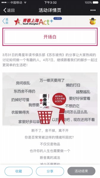 作为一场读书分享会,星动PLUS青年中心在活动文案中首先简单介绍了两本书的大致内容,以及分享者的基本信息,在最大程度上帮助对该活动有兴趣的青年在活动开始前就能对活动有一个大致的了解。紧接着,文案中还贴出了青年中心往期图书分享会的照片,带来了更直观的现场感受。在文案的最后,为了更清楚直接地标示活动所在地,星动PLUS青年中心还特意制作了一张标有周边醒目地表的地图,更贴心地注明了地铁出口号码。相比较许多仅有简单的活动介绍的文案,这份读书分享活动的文案可以说是一篇“良心文案”,不仅能让浏览者更全面地了解活动信息,也让大家看到了主办方的用心。