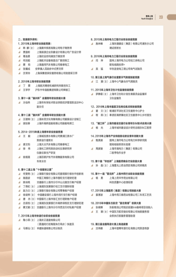 一、推荐评选序列: ◢ 沈 燕(女) 上海市浦东新区公利医院超声科诊断医师 ◢ 黄振懿 上南中学南校校长、党支部书记 ◢ 郑路逸 上海汇展信息科技有限公司合伙人 ◢ 陈 希 上海市公安局浦东分局法制办公室应诉复议员 ◢ 李睿飞 上海浦东软件园股份有限公司发展计划部经理 ◢ 刘亚锋 上海申瑞继保电器有限公司工程部副经理 ◢ 杨芸峰 徐汇区枫林街道社区卫生服务中心中医全科医生 ◢ 徐建军 公安局徐汇分局南站治安派出所南苏丹维和、南站治安派出所执法办案队民警 ◢ 张 莹(女) 长宁区税务局第一税务所科员 ◢ 王 震 中国科学院上海硅酸盐研究所科研人员 ◢ 金玉鑫 春秋航空股份有限公司签派带班主任 ◢ 刘瓯铭 上海友闲信息科技有限公司创始人兼CEO ◢ 徐江海 上海乐助乐龄为老服务中心中心主任 ◢ 蒋 浩 上海市普陀区人民法院研究室副主任 ◢ 刘有骏 上海市公安局普陀分局政治处宣传科民警 ◢ 高镜之(女) 上海镜峰国际贸易有限公司总经理 ◢ 周瑜婷(女) 上海市梅陇中学语文教师 ◢ 王志亮 虹口区人民检察院侦查监督科副科长 ◢ 陈逸菲(女) 上海市虹口区市场监督管理局嘉兴市场监督管理所综合组组长 ◢ 徐炜莉(女) 上海市少云中学德育副主任 ◢ 邵春萍(女) 杨浦区控江医院护理 ◢ 张 杨 上海图聚智能科技股份有限公司创始人兼CEO ◢ 胡哲人 上海流利说信息技术有限公司首席技术官 ◢ 顾敏杰 安利(中国)日用品有限公司上海分公司安利体验馆店铺高级助理 ◢ 张博文 黄浦公安分局打浦桥派出所治安打击组警长 ◢ 潘晓琳(女) 上海童涵春堂药业股份有限公司副店长 ◢ 张家昕 上海老凤祥首饰研究所有限公司生产经营部制作工,拋镀班组组长 ◢ 王寅成 静安区住房保障和房屋管理局修缮改造科 副主任科员 ◢ 谢 婧(女) 上海市静安区闸北实验小学副校长 ◢ 姜开源 静安公安分局交警支队第三责任区天目梅园岗组民警 ◢ 邱彦群 静安区中心医院外科主治医师 ◢ 谢一鸣 易谷网络科技有限公司技术总监 ◢ 赵琪昊 静安区人民检察院检察官 ◢ 邹 勋 上海建筑设计研究院有限公司高级工程师 ◢ 张晓雯(女) 闵行区发展和改革委员会发展规划科科长 ◢ 王 凯 闵行区检察院公诉科检察官 ◢ 蔡正军 上海神州汽车节能环保股份有限公司部长 ◢ 倪 静(女) 闵行区环境监察支队环境监察执法人员 ◢ 周玉婷(女) 高境十一村居委会党支部书记 ◢ 刘晴雯(女) 宝山区市场监督管理局综合执法大队六中队队长 ◢ 刘礼珺(女) 上海市宝山区人民检察院公诉科检察员 ◢ 杜 猛 上海市公安局嘉定分局刑事科学技术研究所法医探组探长 ◢ 王 飞 上海市嘉定区中心医院急诊科主治医师 ◢ 金志斌 上海市嘉定自来水有限公司净水工 ◢ 章健勇 上海蔚来汽车有限公司软件开发经理 ◢ 杨晓城 上海市公安局金山分局象州路派出所社区民警 ◢ 胡 婧(女) 上海市张堰中学发展研究处副主任、语文教师 ◢ 戚晓霞 复旦大学附属金山医院伤口造口护理 ◢ 陈晓锋 上海城通轨道交通投资开发建设有限公司项目经理 ◢ 吴晨炜 上海市公安局松江分局交通警察支队副中队长 ◢ 王 溯 上海新阳半导体材料股份有限公司总工程师兼研发总监、技术中心主任 ◢ 洪东亮 上海市水利工程集团有限公司项目经理 ◢ 蒋梅蓉(女) 上海青浦发展(集团)有限公司总师室副总师 ◢ 陈 磊 青浦区白鹤镇社区事务受理服务中心办公室社工招聘 ◢ 杨碎平(女) 上海金发科技发展有限公司行政主管 ◢ 周董生 日立电梯(上海)有限公司生产主管 ◢ 许 华(女) 奉贤区城市管理行政执法局执法队员 ◢ 汤 浩 上海奉贤建设发展集团市政公路工程有限公司项目经理 ◢ 应晓捷 上海亚泽新型屋面系统股份有限公司执行总裁 ◢ 朱方于 上海易和广告有限公司总经理 ◢ 夏元琦 崇明县文化馆辅导部副主任 ◢ 宋 昊 上海市崇明县农村水利管理所河道管理科科长 ◢ 蒋丹枫 宝钢集团南通线材制品有限公司总经理助理 ◢ 孙忆敏 上海宝地置业有限公司规划管理总监 ◢ 何金平 上海船舶运输科学研究所项目经理 ◢ 谢岩松 上海中远海运油品运输公司新宁洋轮二副 ◢ 董明水 中海国际船舶管理有限公司船舶政委 ◢ 李立兰(女) 东航金控有限责任公司产品设计 ◢ 杨文皓 东方公务航空有限公司工程师 ◢ 林旭栋 上海市文化广播影视监测中心系统监测运维 ◢ 陈家翔 SMG东方卫视中心导演 ◢ 王 政 SMG五星体育传媒有限公司主持人 ◢ 章博亮 上海美术设计有限公司美术指导 ◢ 李 嵩 上海商务数码图像技术有限公司扫描技术主管 ◢ 杨 柳(女) 中煤科工集团上海研究院天地科技股份有限公司上海分公司销售经理 ◢ 朱唯丰 上海材料研究所产品研发、项目管理 ◢ 郭佳楣(女) 上海市科技创业中心科技信贷 ◢ 高元钧 中国电子科技集团公司第三十二研究所主管设计师 ◢ 仇宝华(女) 普陀区石泉街道社区卫生服务中心全科医生 ◢ 李 芬(女) 上海市医学科学技术情报研究所(上海市卫生发展研究中心)助理研究员 ◢ 蒋 莅(女) 复旦大学附属儿科医院麻醉科临床医师 ◢ 赵 亮 复旦大学武装部行政管理 ◢ 张 赫 上海交通大学医学院附属第九人民医院眼科科研人员 ◢ 高磊青(女) 上海交通大学医学院附属仁济医院肝脏外科移植监护室护士长 ◢ 王 江 上海大学教师 ◢ 张晓燕(女) 上海中医药大学附属岳阳中