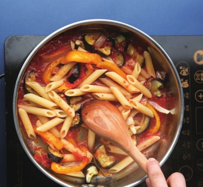 茄子1根,甜椒一只,洋葱半个,斜管面250g,番茄罐头 500g,盐,黑胡椒,橄榄油调味。