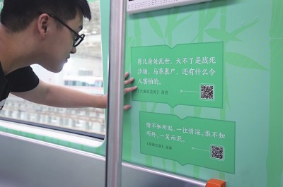 阅读专列的六节车厢刷上六种颜色,对应儿童、爱情、武侠、科幻、推理、历史六个主题。车厢内壁印着一段段书摘,都选自浙江省市民喜爱阅读的经典书目,扫描每段话下方的二维码,即可生成专属的书言海报模板进行朋友圈分享。