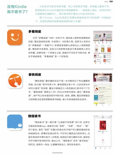 从在实体书店买传统书籍、网上书店购买书籍、在电脑上看电子书,到用各类以Kindle为首的电子阅读器看书……阅读使人成长,没有时间行万里路的忙碌都市人,用万卷书弥补着内心对远方的向往。 除了Kindle,App市场里又有哪些阅读类软件可供选择?市场细分下,全新的阅读体验能给阅读增加多少乐趣? 多看阅读 打开“多看阅读”内的一本电子书,首先映入眼帘的是精致的封面,随后是版权信息、作者简介、内容简介等。纸质书上有的内容“多看阅读”一样都不少,即便是系统默认排版也让人觉得很舒服。精选多字体混排、 自定义行间距等功能设计更是颇具人性化的考量。如果你是一个完美主义者,阅读时不仅在乎书的内容,更在乎阅读感受,“多看阅读”是一个好选择。 拿铁阅读 “拿铁阅读”最有趣的点在于每一本书都经过了专业编辑的浓缩,标注着“原书有多少字,拿铁提取出多少字,以及花多长时间可以读完”的信息,譬如卡耐基的《人性的弱点》原书有17.7万字,“拿铁阅读”提取出1.3万,约32分钟就可读完。通过“拿铁阅读”,用户可以先快速浏览书中的内容、结构、逻辑,随后再根据自己的判断决定是否需要找原书阅读,减小无效阅读的机会成本。 微信读书 “微信读书”是一款打着“让阅读不再孤单”的口号,自带社交基因的阅读App。底部共分成“发现”、“书架”、“想法”、“我”四个板块。首页“发现”栏最大的亮点在于用户可以看到微信好友的阅读动态。查看好友读过的书,不仅可以满足自己的好奇心,也能在朋友的书单中进行二次筛选,找到自己感兴趣的内容,缩短在茫茫书海中淘书的时间。除此之外,“微信读书”还有“读书电台”的栏目,选择任一电台,让眼睛休息会儿,用耳朵来读书。