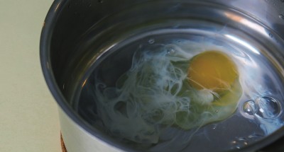 2.新鲜鸡蛋的蛋白是非常完整的,溏心蛋尽可能选择最新鲜的鸡蛋。若鸡蛋放了几天的话可以把鸡蛋先敲到一个小碗里,再用勺子在锅里搅出一个漩涡,将鸡蛋慢慢倒入漩涡中心。水流会将鸡蛋牢牢地控制在锅子的中心。