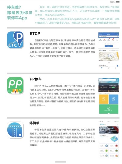 有车一族,都吃过停车的苦:兜兜转转找不到停车位;取车时忘了车停在哪;排队车辆太多被堵在停车场出入口;还有老大爷乱收费……围绕停车的痛点太多,停车App应运而生。 然而,市面上超过200款停车App到底应该怎么选?各有什么优势?这里小编选择了几款好评最多的App,挖掘它们各自特色,看看哪款最适合你呢? ETCP 目前ETCP查找附近停车场、手机缴停车费功能已经比较成熟,车位预约功能尚待提高;共享单车的引入很有想象力,为车主解决停车后的“最后一公里”。使用过程中,总体感觉比较流畅和人性化,比传统的停车方式省时省力,作为一款较为成熟的停车App,ETCP比较稳妥地实现了现有功能。 PP停车 对于PP停车,从期待到失望只有一个“场内找车”的距离。场内找车这项功能,在ETCP和停简单上都没有实现,却被PP停车实现了,令人不得不刮目相看,而这也是小编决定深度体验它的原因之一。然而,体验完之后,给人的感觉只有失望:找车位的基础功能没有做好,扫码付费的功能很鸡肋,附加的场内找车功能则完全不知所云…… 停简单 停简单的界面是三款App中最为小清新的,核心业务当然是停车,其他周边产品包括违章查询、电动车充电、二手车估价等也在逐渐完善中。虽然目前周边功能的开发做得没有行业老大ETCP好,但是好在每个服务的体验感都还不错,并没有滥竽充数的嫌疑。