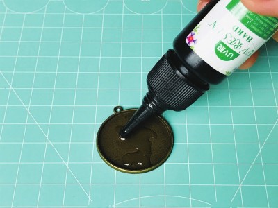 在边框内薄涂一层UV胶打底,用牙签均匀涂抹,在紫外线灯下一分钟照干,或放置在日光下五至十分钟使其固化。