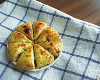 2018,是“蛙年”。相信大家都知道今年火到飞起的游戏“旅行青蛙”。很多人都在苦苦等着自己的蛙回家,一心存钱给自己的蛙买好吃的,等着自己的蛙给家里寄明信片。作为蛙蛙的亲生父母,大家一定想和蛙蛙同吃同住,就让我们一起来还原可爱的“蛙蛙食谱”吧! 葡萄司康饼 用料: 中筋面粉100g,绵白糖18g,泡打粉2g,牛奶55g,鸡蛋2个,葡萄干适量 做法: 1.将一个鸡蛋的蛋黄蛋清分离,取蛋黄,加入牛奶,白糖搅拌到糖融化。 2.面粉泡打粉混合,然后加入上步中的混合液,用筷子搅拌后,加入葡萄干,然后捏合成团,不要过分揉面。 3.松弛面团15min。烤盘铺锡纸(或油纸),烤箱预热180度。将另一只鸡蛋打散,用于面团表面刷蛋液。 4.将面团压扁成1.5cm厚的圆饼状。对角切成8块。 5.把切好的面团放在锡纸上,表面刷蛋液。烤制15min即可。 韭菜巴坦木煎饼 用料: 中筋面粉150g,巴坦木仁30g,韭菜100g,盐,花椒粉,香油,花生油 做法: 1.面粉加水揉成光滑的面团,松弛面团20min。 2.韭菜、巴坦木仁切碎混合,加入一汤勺花生油,适量花椒粉和香油,搅拌均匀。 3.松弛好面团后,在韭菜巴坦木馅料中加入一小勺盐,搅拌均匀。 4.取适量面,擀成圆形面皮。在面皮中加入馅料。然后捏合边缘,按扁成饼状。 5.电饼铛加热,放入少许食用油,将饼坯放入锅中用中小火烙制。及时翻面,两面金黄色即可出锅。 Tip: 1. 韭菜加盐容易出水,所以切勿提前加盐,在包之前加盐即可。 2. 没有电饼铛的话,也可以用平底锅代替。