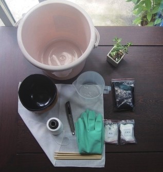 购买自己喜欢的染料颜色,染料和碱剂、还原剂的比例为10:2:3,和水的比例为1:25;准备好棉布、染布桶、量杯、漂洗盆、胶手套、小刀、捆扎线、木棒和夹子。