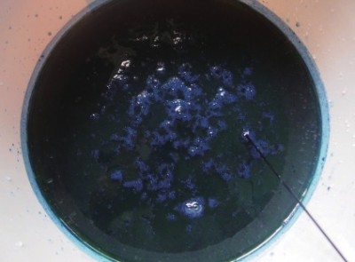 将100克染料、20克碱剂和30克还原剂一起倒入2.5升水中搅拌均匀,等待30分钟左右,直至液体由蓝色转变成黄绿色,水表面有些许气泡。