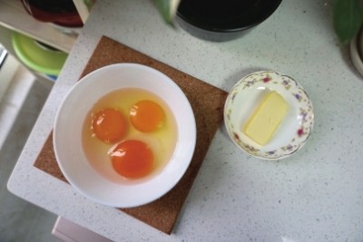 鸡蛋 3个,黄油 5g,盐 1g,全脂牛奶 10g