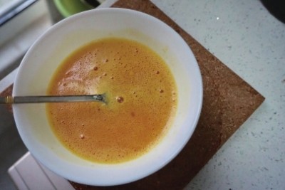 1.鸡蛋打入大碗中,加入盐和牛奶,搅匀,然后静置15min。