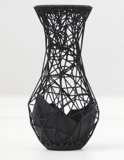 设计师Ivan Zhurba 创作的这个名叫The Wire的3D打印花瓶,黑色线条如织线般缠绕环合成一整个花瓶的外形,瓶底内部的黑色托盘与外部织线产生双重质感。