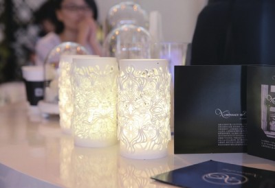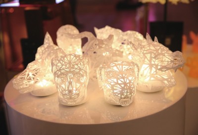 一楼的中央展厅Xuberance 极致盛放展台,被改造成了一座咖啡馆。从桌椅吧台配套,到一盏灯,桌上的烛台、咖啡杯和勺子,甚至是一颗糖,都是由3D打印技术营造出的。在咖啡馆特别处理的黄色灯光下,那些洁白的3D打印产品的漂亮的花纹,显得特别美。而一边放置的3D打印的婚纱礼服,更显得别致华丽。走近咖啡吧台前,几台3D打印机还在运作着,打印着动物形状的零食,参观者可以在现场品尝到3D打印而成的食物,而打印一块食物,则需要九十分钟左右。
