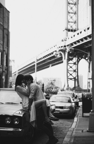 曼哈顿大桥前,一对情侣靠在老爷车上热吻。