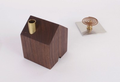 小屋子的形状就像一个家,在屋顶部加入了一个铜管作为视觉上的烟囱。屋子内部掏空,放置点燃的盘香。烟就从烟囱里慢慢飘出,这是一幅美丽的风景,也是一个香器。