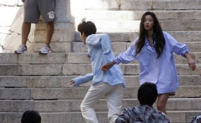 SBS新剧《蓝色海洋的传说》正在西班牙热拍。近日,有网友拍到李敏镐和全智贤的重量级戏份拍摄现场:李敏镐饰演的超级邪恶骗子似乎与人发生了争执,而全智贤刚开始在旁边静静站着看不说话,而后,李敏镐拉起她的手意欲狂奔……从图片状态看,全智贤的身材已经完全恢复到生产前的最佳状态。