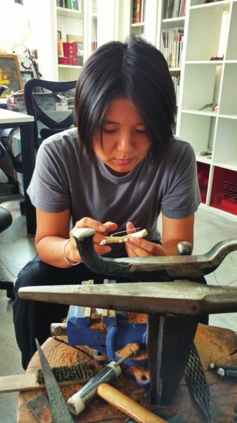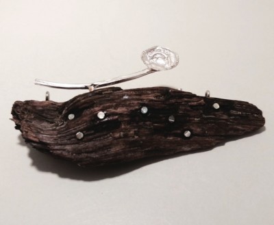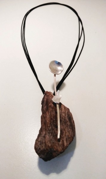朋友问我,你的首饰中就不能有一些黄金宝石吗?就不能材料再贵重一些吗?我说,材料贵不贵重不是我作品的价值,我重视各种材料在首饰中的运用,材料是大自然的馈赠,材料是无辜的、是平等的,黄金珠宝也是材料,但被人类区分了等级和地位,某种程度上也扭曲了人的价值取向。 在工作室的首饰教学中,我与学生经常探讨材料在首饰艺术中的运用和表现。毕业于上海戏剧学院导演系的学员,严彗轩,更是通过亲身的创作来增强了对材料与首饰的理解。严彗轩说她以前总是把首饰和珠宝混为一谈。可同时又一直有种对自己的觉察和认知。“比如说,对那种昂贵的、带有钻石、宝石元素、外观上明明像是个设计但又谈不上什么设计的传统珠宝,就是喜欢不上来。与之相对的,对那些材质上、理念上非常直接和质朴的作品怀有期待。”严彗轩在工作室做了一些作品之后,渐渐明白,首饰创作和首饰内里所包含的是如此广阔的表达空间,同时亦能彰显佩戴者独特的品位和个性。也许你的作品并不需要嘎吱嘎吱锯出一片叶子放在里面,却能表达叶落飘零的孤寂,也许一块未经雕琢的璞石给人的冲击大大超越精心打磨过的宝石。 我提倡工作室学员们平时注意收集和保存各种材质,与材料交流和对话,以材料为基调静心思考作品的主题。而在这个过程中,自然材质的质朴和浑然天成的内在力量给了大家许多创作的动力和表达的机会。2013年暑假,严彗轩去美国游玩,正值盛夏,一次散步路过一片林子,都是四五十米的参天巨木,感叹之余,瞥见树下零星分布着形态各异的小块残木,那些小木头黑黑沉沉的,感觉吸饱了水分,又松松软软,表面的机理并不粗糙,反而给人一种天然的韵律感,心里一动,就捡了若干,回家放在壁炉上方的装饰隔板上。谁知这一放就放到了2016年的春夏。当她再次从壁炉隔板拿起它们的时候,有点惊奇。它们拿在手上轻若无物;清浅的色泽代替了原来的黑沉,而最令人惊喜的是它的硬度。也许是经过两个冬天,壁炉每日烧火,余热烘烤着四周,使得那些残木原先有些酥软的机理,变得非常坚硬。“我瞬间觉得缘分到了,就迫不及待地去找吴老师。之后,经过锯银板、压薄、冲压、焊接等工序,再与不经任何加工的木头块相接,做出了《木生花》系列地两件作品,其实名字是逐渐清晰出来的。” 严彗轩在作品的背后安置了胸针和项链扣,这样既能佩戴于胸前,又能搭配一些朴实简约的服装当挂饰。严彗轩因为喜欢对自然材质的发挥体验,又找了个海石花(一种海里生存的植物,干燥后呈木质)加上2颗小珍珠,以之前的方式和概念又做了一个。此后,由于有了对自然界材料的延展的第一次尝试,她越来越注意在日常生活中关注那些看似不起眼但又具有耐看形态的各种材质,希望能找到那种看一眼就能激发创作欲望和灵感的好事物。 用各种材料创作首饰作品,将材料、理念与作品形态浑然于一体,创作者带着真诚的理念,发挥材料的生命力,创作和佩戴具有艺术美感与精神价值的当代首饰艺术作品,正是对生活的表达,这也是当代首饰艺术的当代意义所在。