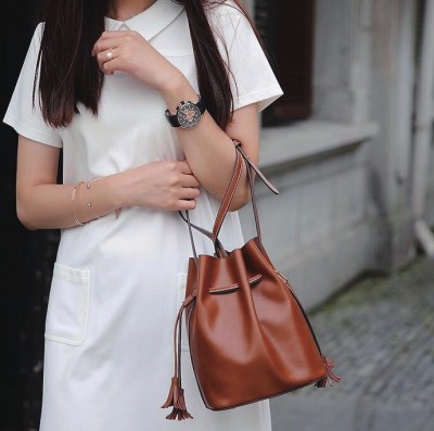 水桶包与流苏也是绝配,流苏可以作为包上的装饰,也可以作为水桶包的主体,自然的垂坠感,让水桶包在随性的同时,又显得飘逸优雅。
