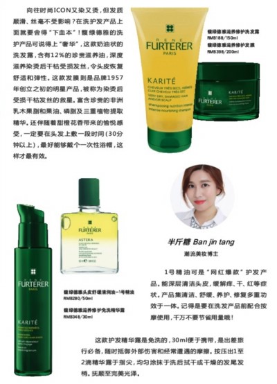 向往时尚ICON又染又烫,但发质顺滑、丝毫不受影响?在洗护发产品上面就要舍得“下血本”!馥绿德雅的洗护产品可说得上“奢华”,这款奶油状的洗发露,含有12%的珍贵滋养油,深度滋养染烫后干枯受损发丝,令头皮恢复舒适和弹性。这款发膜则是品牌19 57年创立之初的明星产品,被称为染烫后受损干枯发丝的救星。富含珍贵的非洲乳木果脂和果油、磷脂及三重植物提取精华。还伴随着甜橙花香带来的愉悦感受,一定要在头发上敷一段时间(30分钟以上),最好能够戴个一次性浴帽,这样才最有效。 1号精油可是“网红爆款”护发产品。能深层清洁头皮,缓解痒、干、红等症状。产品集清洁、舒缓、养护、修复多重功效于一体。记得是要在洗发产品前配合按摩使用,千万不要节省用量哦! 这款护发精华露是免洗的,30ml便于携带,是出差旅行必备,随时抵御外部伤害和经常遭遇的摩擦。按压出1至2滴精华露于指尖,均匀涂抹于洗后拭干或干燥的发尾发梢。抚顺至完美光泽。