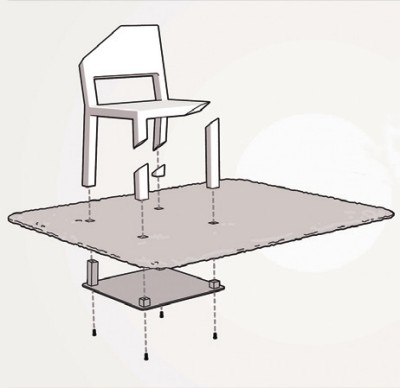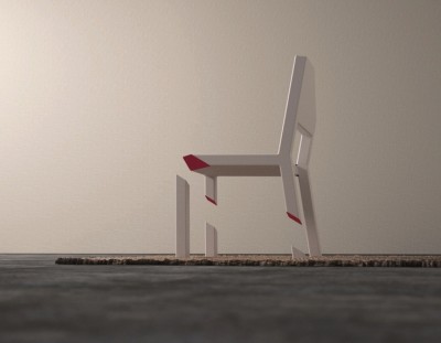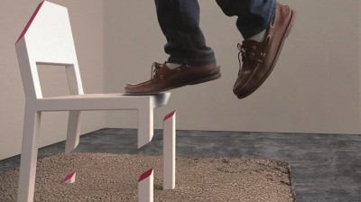 椅子的四个凳脚断裂了,却依旧保持着平衡?这把好像一坐上去就坍塌的椅子,实际上拥有一个稳定牢固的座位。椅子下方的地毯并不是装饰,而是为其提供了一个稳固的基础,地毯上方有三条凳腿,看上去就像奇迹般地和椅子分开了。