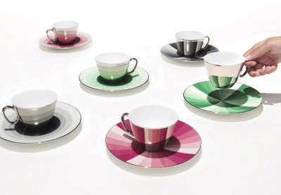 如果将茶杯和托盘比喻成灵动的舞者,那么它们所创作出的华尔兹一定是最契合的舞蹈。将茶杯制作成镜面的效果,和色彩丰富的托盘摆放在一起之后,就会在茶杯上反射出不同的图案效果。虽然简单,但却能充满戏剧性和趣味性。