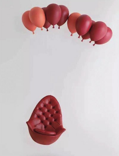椅子被倾斜地固定在墙上,而并不是真的由气球拉起来的,气球也是非充气物。但设计师希望能制造出“漂浮”的效果。