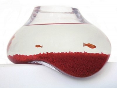 这个独特的有机鱼缸的形态是按放置在桌角边缘来设计的。整体看起来就像一个快要从边缘滑落的水滴,设计师将玻璃加热到熔化状态后,进行手工塑形并辅以力学原理,使得鱼缸能稳固地放在桌子边缘。
