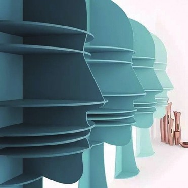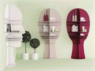 这个储物架的造型多少有点无厘头,正面看只是单纯的椭圆形状,而走到侧面就形成了少女的侧脸。将二维的结构线抽象成三维的书架搁板,侧面轮廓优雅美丽,就好似一个少女在对你微笑。