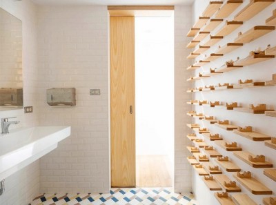 牙科诊所中的浴室也是一处特别的空间,地板上颜色分明的锯齿状花纹显示出轻松活泼的氛围。墙面上的木质搁架用来放置患者的牙刷和牙膏。
